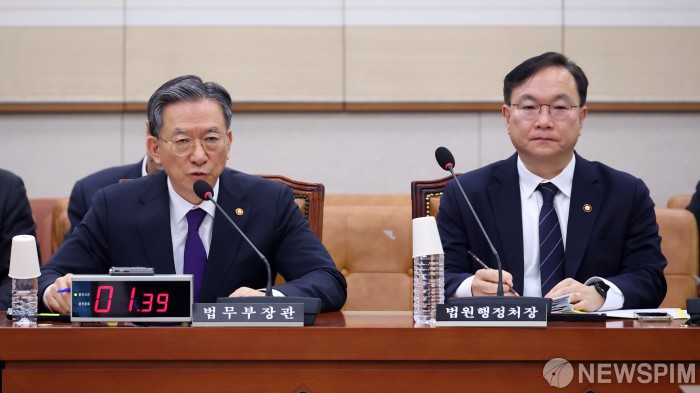 [서울=뉴스핌] 정일구 기자 = 정성호 법무부 장관이 24일 오후 서울 여의도 국회에서 열린 법제사법위원회 전체회의에서 의원 질의에 답변하고 있다. 오른쪽은 박영재 법원행정처장. 2026.02.24 mironj19@newspim.com |