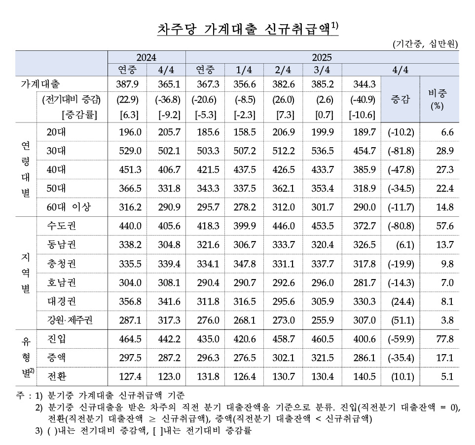 24일 한국은행이 발표한 '2025년 4분기 차주별 가계부채 통계'에 따르면, 4분기 중 차주당 가계대출 신규취급액은 3443만원으로 집계됐다. 이는 전분기(3852만원)보다 409만원(10.6%) 감소한 수치다.