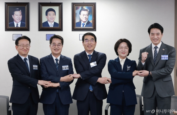 [서울=뉴시스] 김명년 기자= 6·3 지방선거 경기도지사에 도전하는 더불어민주당 예비후보들이 24일 서울 영등포구 여의도 더불어민주당 중앙당사에서 열린 광역단체장 후보 면접에서 기념 촬영하고 있다. 왼쪽부터 더불어민주당 권칠승 의원, 김동연 경기도지사, 더불어민주당 양기대 전 의원, 추미애·한준호 의원. (공동취재) 2026.02.24. photo@newsis.com /사진=조성봉 |