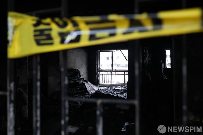 [서울=뉴스핌] 이형석 기자 = 24일 서울 강남구 은마아파트에서 화재가 발생해 출입이 통제되고 있다. 화재로 1명이 사망하고 3명이 부상을 입었다. 2026.02.24 leehs@newspim.com