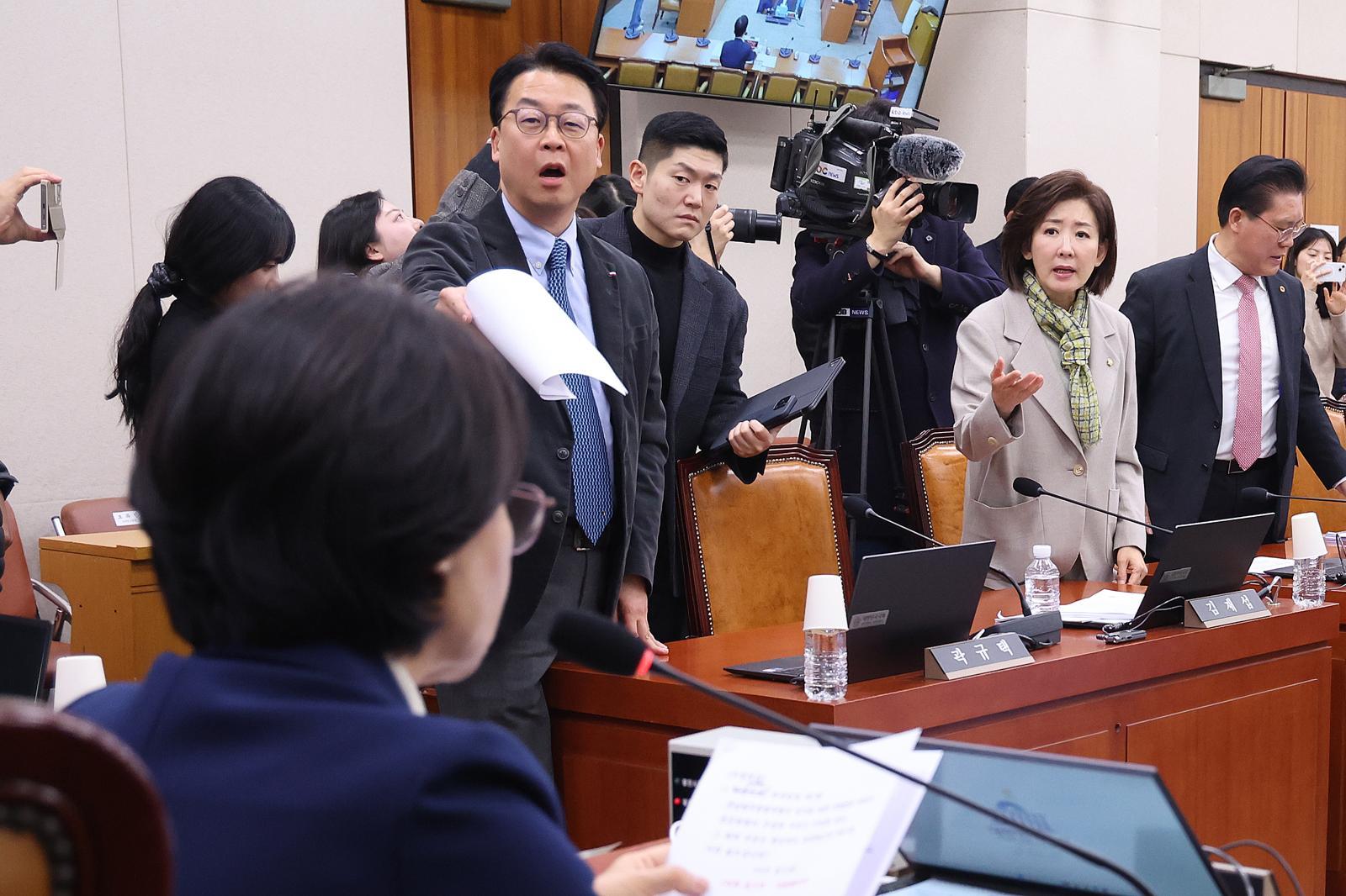 나경원 국민의힘 의원이 24일 오전 서울 여의도 국회에서 열린 법제사법위원회 전체회의에서 추미애 법사위원장에게 의사진행 발언을 신청하고 있다. 뉴시스 |