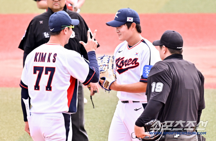 24일 일본 오키나와 가데나 구장에서 열린 야구 대표팀과 KIA 타이거즈의 평가전. 6회초 1사 KIA 데일 강습 타구를 막아낸 김택연이 김광삼 코치와 상태를 체크하고 있다. 오키나와(일본)=박재만 기자 pjm@sportschosun.com/2026.02.24/ |