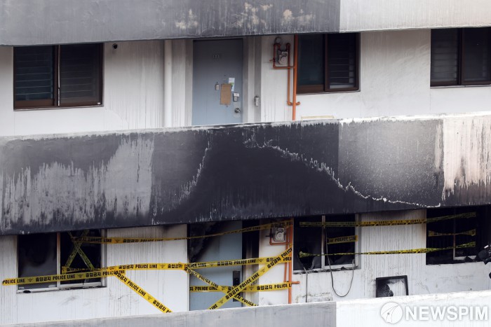 [서울=뉴스핌] 이형석 기자 = 24일 서울 강남구 은마아파트에서 화재가 발생해 외벽이 검게 그을려 있다. 화재로 1명이 사망하고 3명이 부상을 입었다. 2026.02.24 leehs@newspim.com