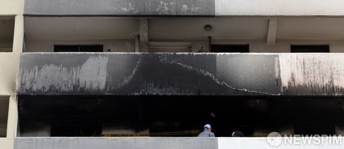 [서울=뉴스핌] 이형석 기자 = 24일 서울 강남구 은마아파트에서 화재가 발생해 외벽이 검게 그을려 있다. 화재로 1명이 사망하고 3명이 부상을 입었다. 2026.02.24 leehs@newspim.com