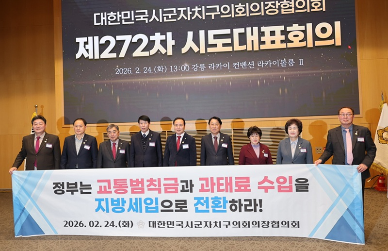 대한민국시군자치구의회의장협의회(회장 김현기)는 24일 강원도 강릉 라카이 컨벤션에서 열린 제272차 시도대표회의에서 ‘교통안전 강화와 지방재정 형평성 확보를 위한 무인교통단속 과태료·범칙금 지방세입 전환 촉구 건의안’을 가결했다.