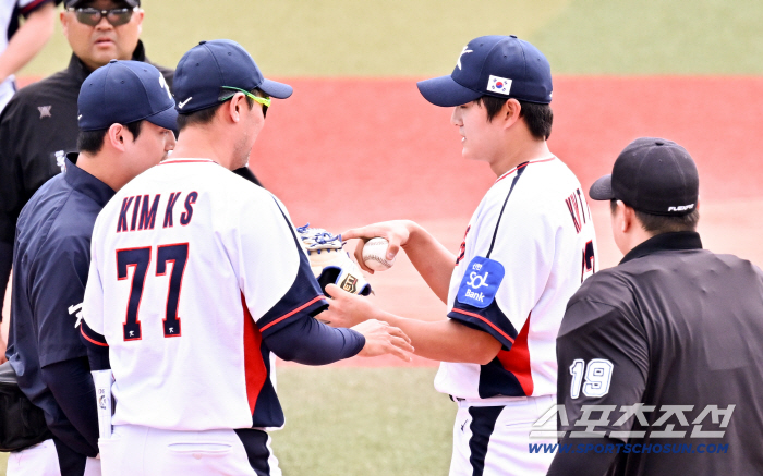 24일 일본 오키나와 가데나 구장에서 열린 야구 대표팀과 KIA 타이거즈의 평가전. 6회초 1사 KIA 데일 강습 타구를 막아낸 김택연이 김광삼 코치와 상태를 체크하고 있다. 오키나와(일본)=박재만 기자 pjm@sportschosun.com/2026.02.24/