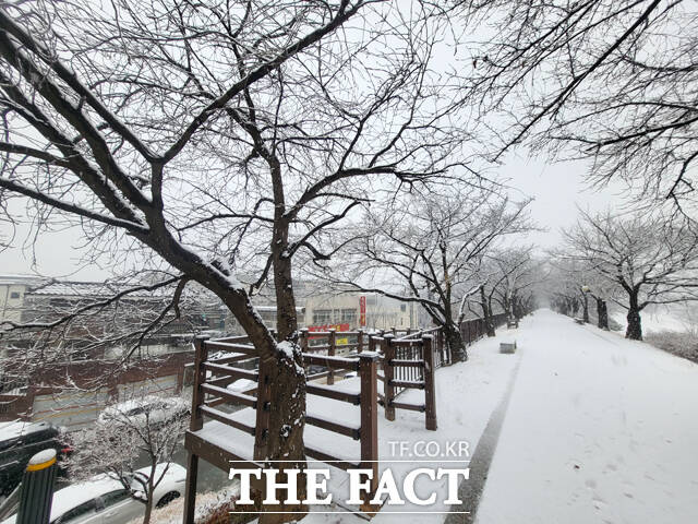 영주시 서천 산책로가 하얀 설국으로 변했다. /김성권 기자 |