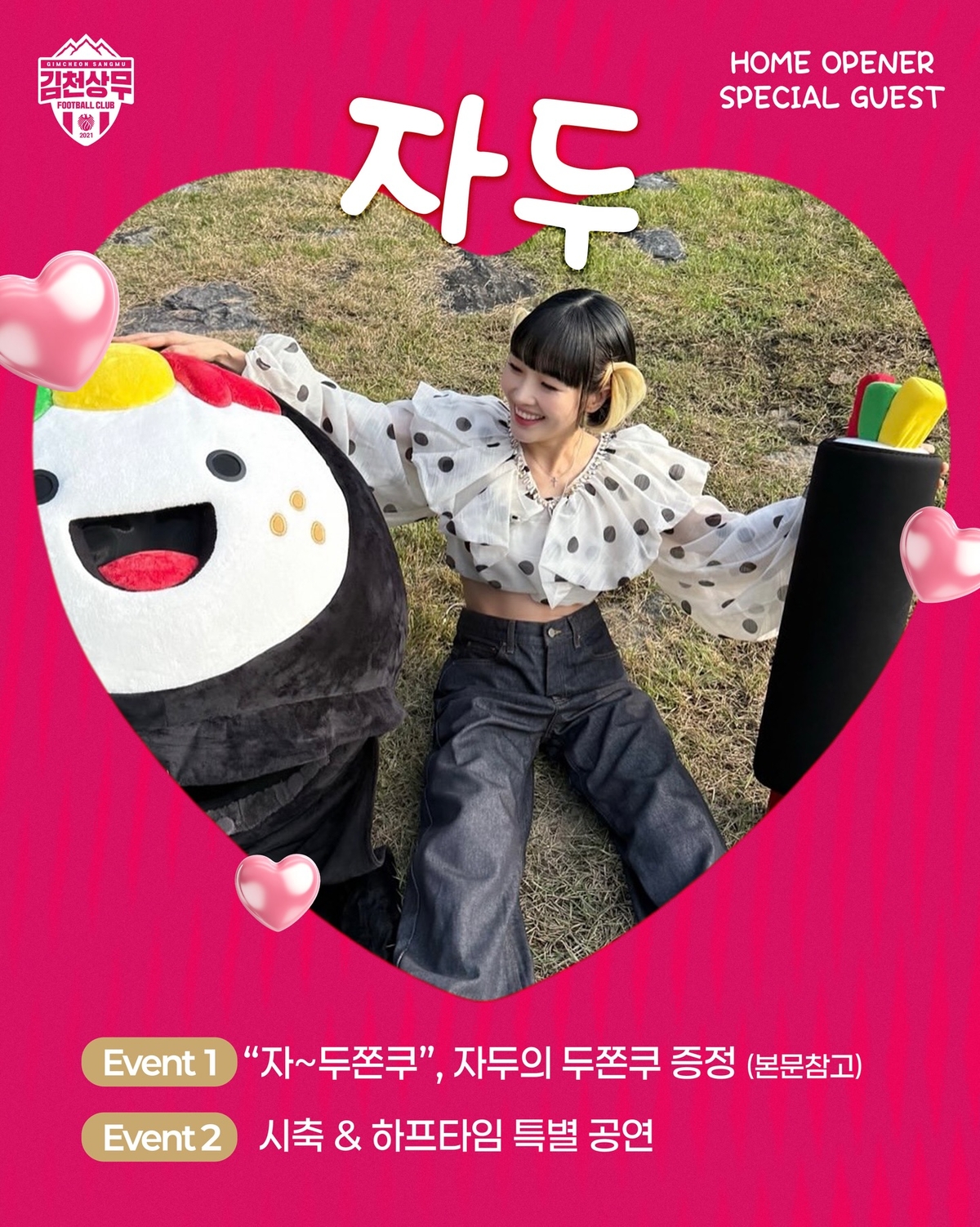다양한 볼거리와 즐길거리도 눈길을 사로잡는다. 이번 홈 개막전은 경기장을 찾는 팬들을 위한 다채로운 이벤트로 가득하다. 초대가수 자두와 두쫀쿠 증정을 비롯해 다양한 홈경기 이벤트가 준비되어 있다. 이날 자두는 김천종합운동장을 찾아 사연 선정자 20명을 대상으로 직접 두쫀쿠를 증정한다. 이어 시축과 하프타임 공연으로 응원 열기를 더한다. 선풍적인 인기를 끌고 있는 두쫀쿠 증정 이벤트도 있다. 사전예매자와 현장 예매자를 대상으로 두쫀쿠 1000개를 증정한다.