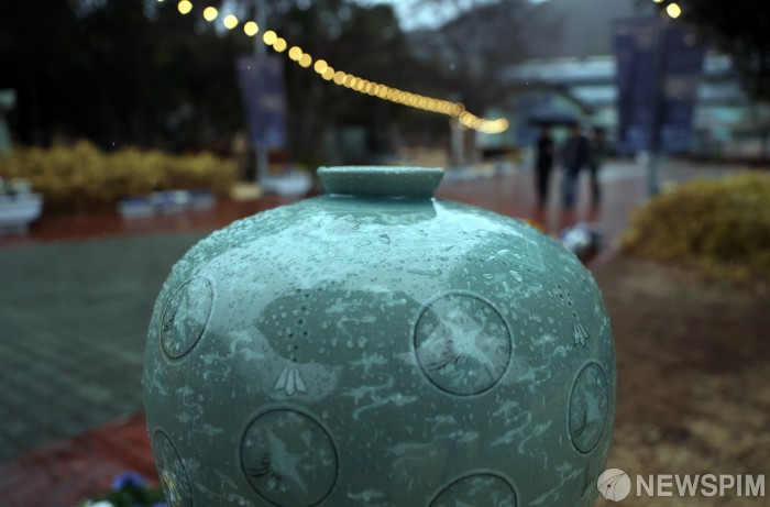 [강진=뉴스핌] 조은정 기자 = 제54회 강진청자축제가 한창인 전남 강진군 대구면 고려청자박물관 일원. 24일 비가 내리고 있는 가운데 고려청자박물관 입구에 조성된 도공비와 청자가 비를 맞으며 관광객들을 기다리고 있다. [사진=강진군] 2026.02.24 ej7648@newspim.com
