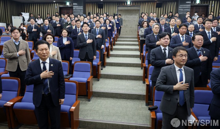 [서울=뉴스핌] 정일구 기자 = 정청래 더불어민주당 대표와 한병도 원내대표가 24일 오후 서울 여의도 국회에서 열린 의원총회에서 참석 의원들과 국민의례를 하고 있다. 2026.02.24 mironj19@newspim.com |