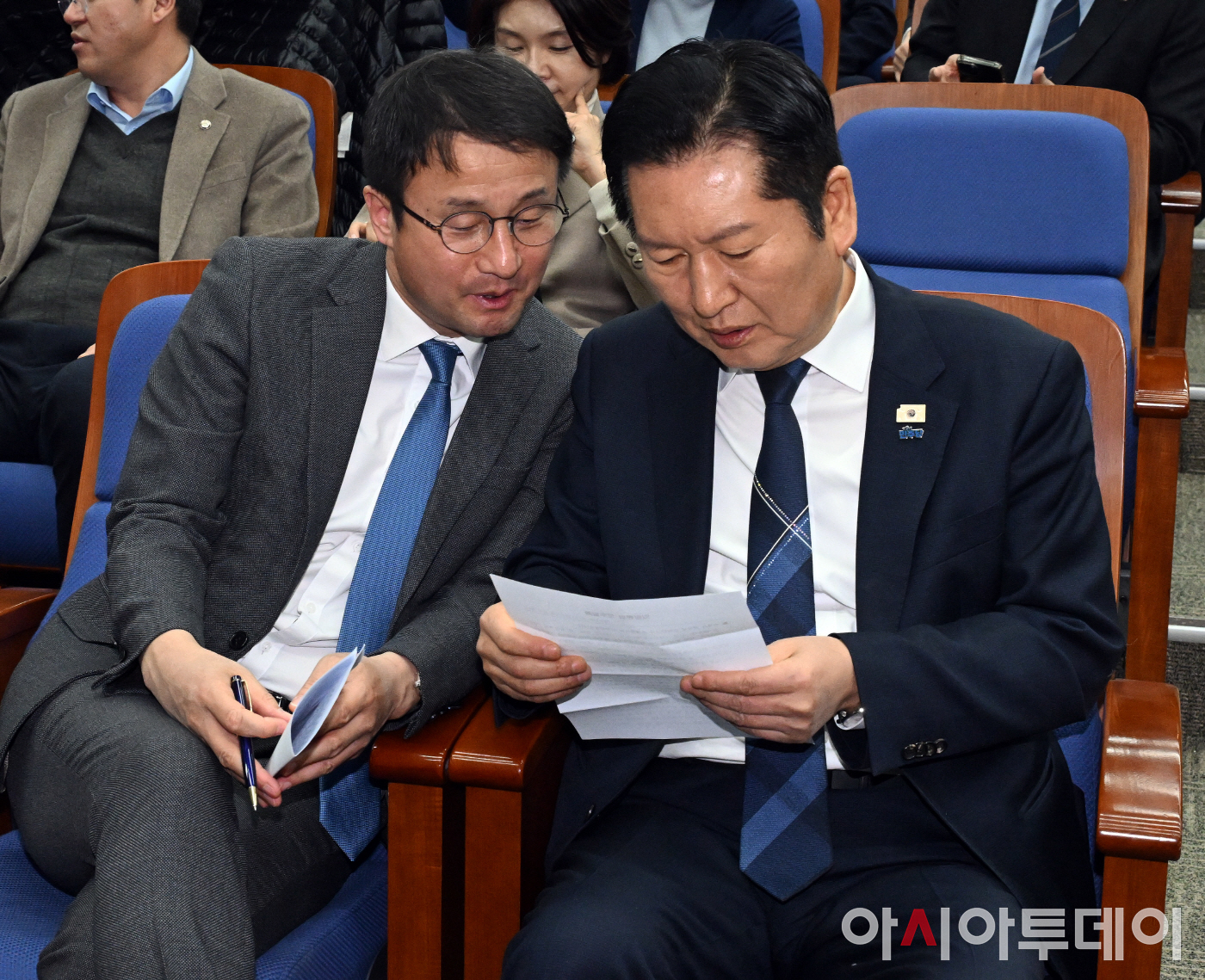 아시아투데이 송의주 기자 = 정청래 더불어민주당 대표(오른쪽)와 한병도 원내대표가 24일 국회에서 열린 의원총회에서 이야기를 나누고 있다.
