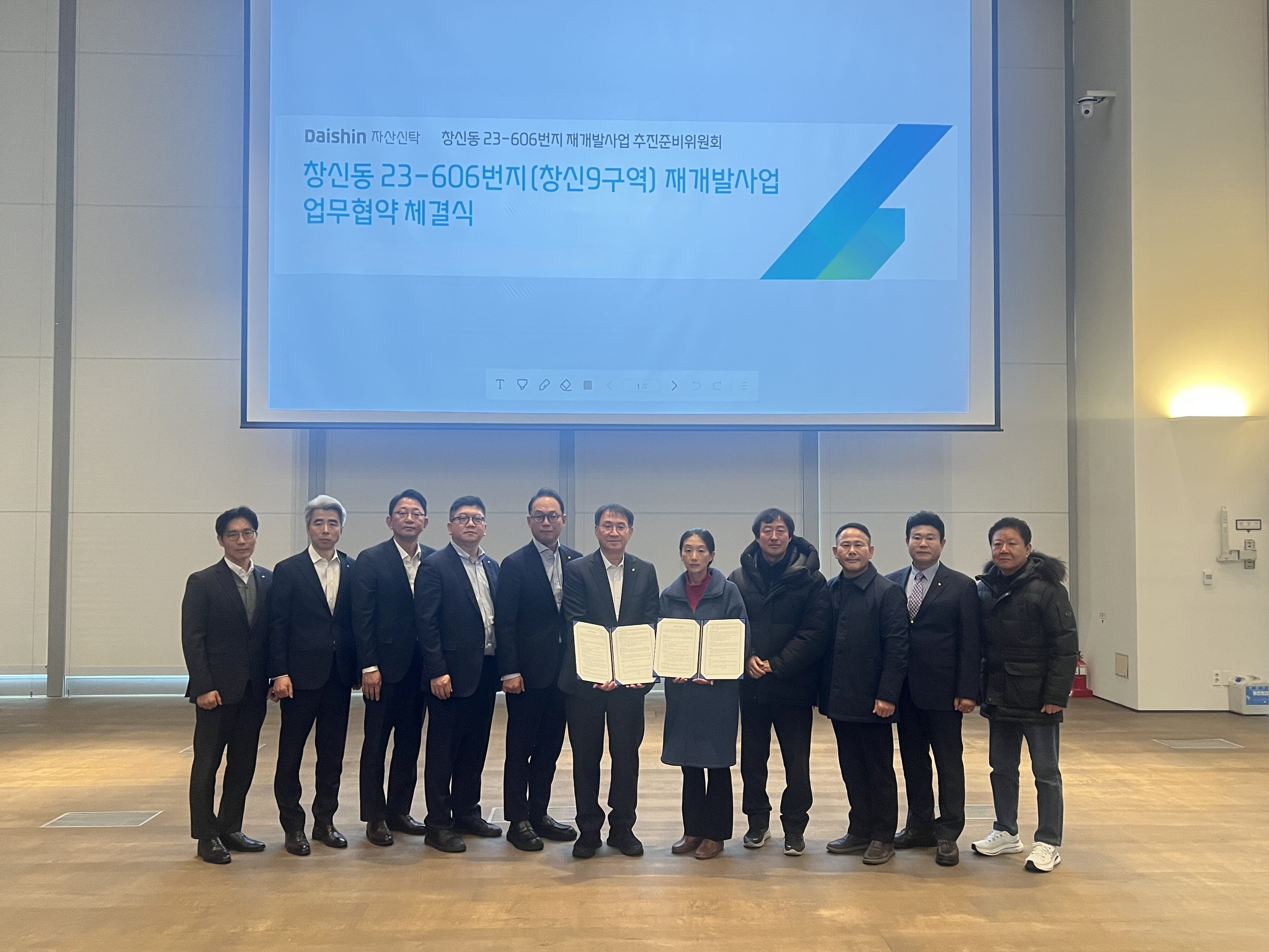 24일 서울 대신파이낸스센터에서 김송규 대신자산신탁 대표이사(왼쪽 여섯 번째)와 하소현 추진위원장(오른쪽 다섯 번째)이 창신동 23-606번지 재개발사업 MOU를 체결했다. /대신자산신탁 제공 |
