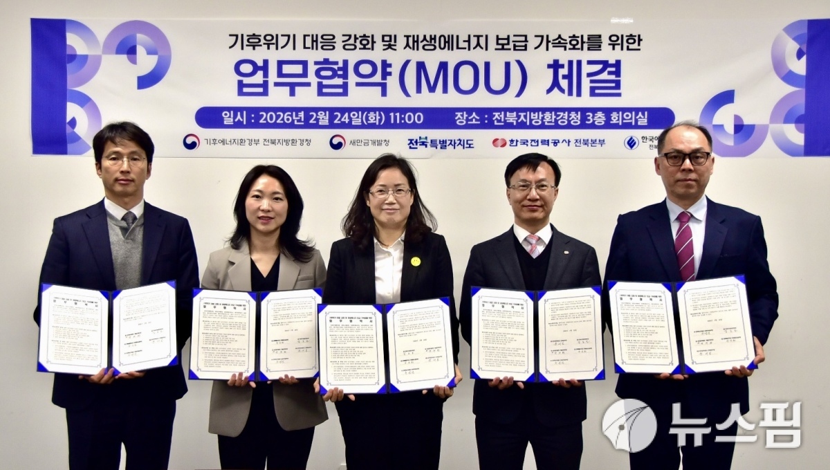 전북자치도는 전북지방환경청, 새만금개발청, 한국전력공사 전북본부, 한국에너지공단 전북지역본부와 재생에너지 보급 가속화를 위한 업무협약(MOU)을 체결했다고 24일 밝혔다.
