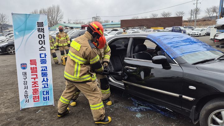[대구=뉴시스] 이상제 기자 = 대구 강서소방서는 24일 하빈면에 있는 폐차장에서 다중 교통사고 대비 특별구조훈련을 실시했다고 밝혔다.
