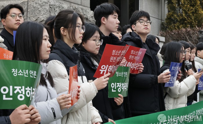 [서울=뉴스핌] 양윤모 기자= 미성년자의 신문·정기간행물 등록금지 헌법소원 청구 기자회견이 24일 오후 서울 종로구 헌법재판소 앞에서 '청소년 독립신문 도끼풀' 주최로 열렸다. 2026.02.24 yym58@newspim.com
