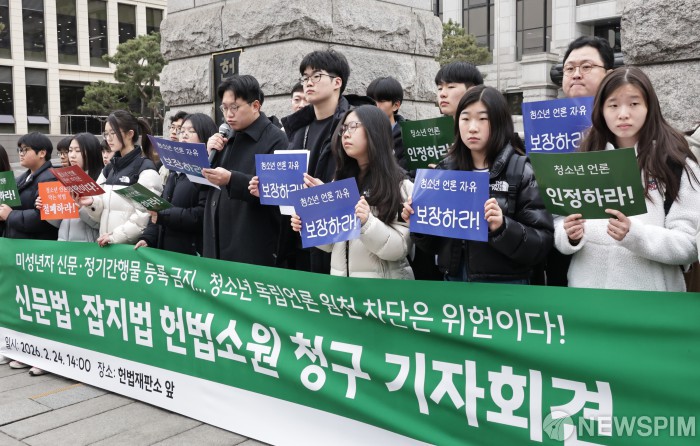 [서울=뉴스핌] 양윤모 기자= 미성년자의 신문·정기간행물 등록금지 헌법소원 청구 기자회견이 24일 오후 서울 종로구 헌법재판소 앞에서 '청소년 독립신문 도끼풀' 주최로 열렸다. 2026.02.24 yym58@newspim.com