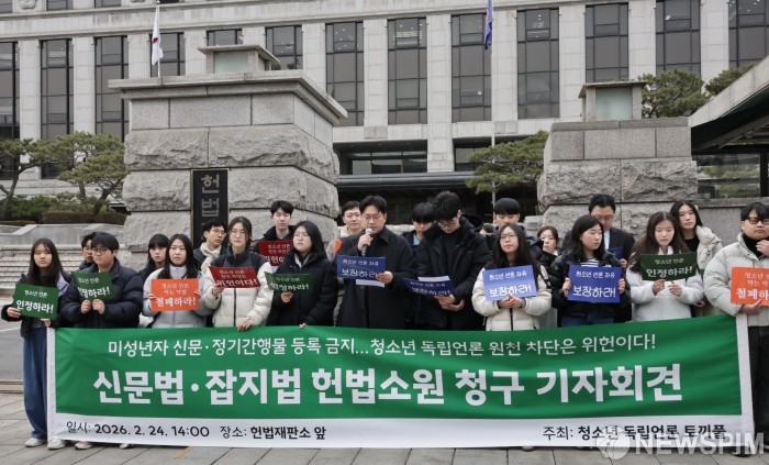 [서울=뉴스핌] 양윤모 기자= 미성년자의 신문·정기간행물 등록금지 헌법소원 청구 기자회견이 24일 오후 서울 종로구 헌법재판소 앞에서 '청소년 독립신문 도끼풀' 주최로 열렸다. 2026.02.24 yym58@newspim.com