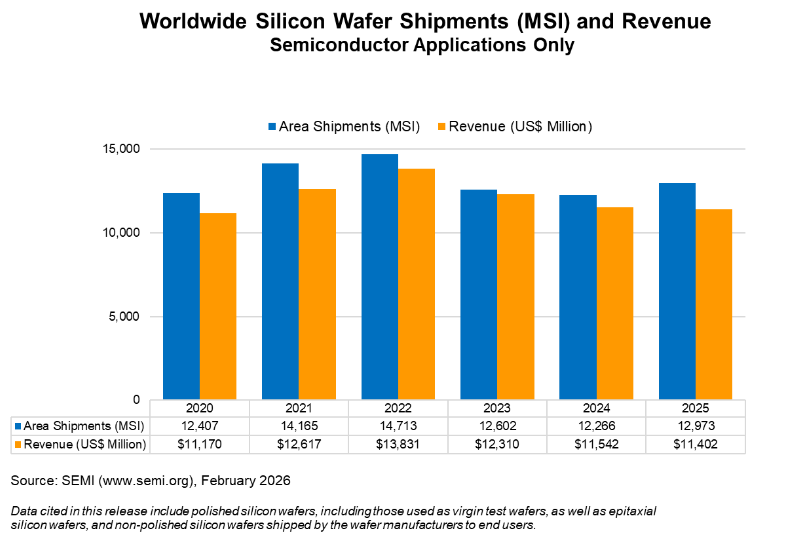 인공지능(AI)을 중심으로 한 첨단 반도체 수요 확대에 힘입어 지난해 글로벌 실리콘 웨이퍼 출하량이 반등했다. 다만 가격 회복이 더디게 진행되면서 매출은 소폭 감소했다.