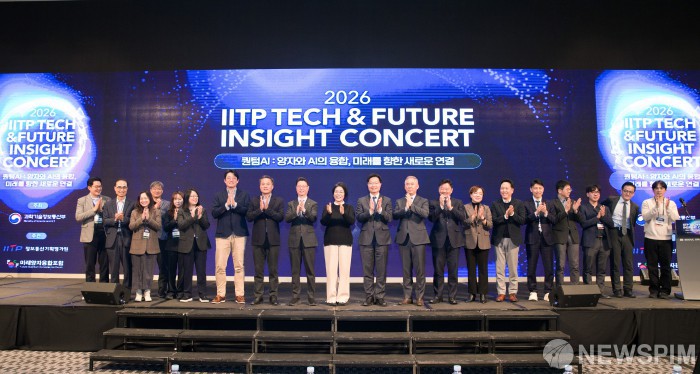 [서울=뉴스핌] 24일 오전 서울 용산구 드래곤시티호텔 한라홀에서 열린 '2026 IITP Tech & Future Insight Concert'에서 홍진배 정보통신기획평가원장(왼쪽 아홉 번째부터) , 최민희 국회 과학기술정보방송통신위원회 위원장,구혁채 과학기술정보통신부 제1차관이 발표자들과 기념촬영을 하고 있다.[사진=과학기술정보통신부] 2026.02.24 photo@newspim.com