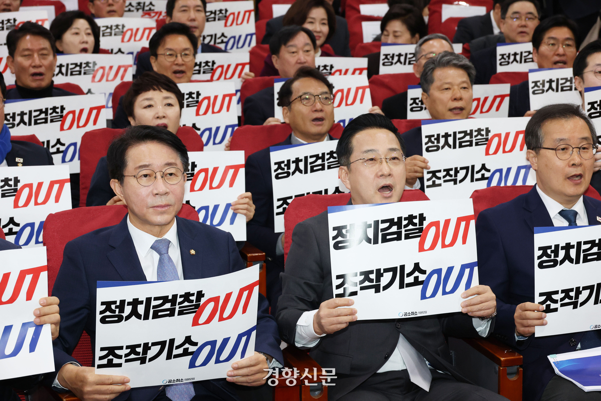 이재명 대통령 사건 공소 취소와 국정조사 추진을 위한 의원모임에 참여한 더불어민주당 의원들이 23일 국회 의원회관에서 열린 출범식 및 결의대회에서 손팻말을 들고 있다. 한수빈 기자 |