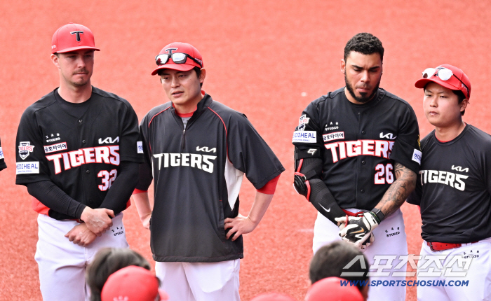 24일 일본 오키나와 가데나 구장에서 열린 야구 대표팀과 KIA 타이거즈의 평가전. 경기 종료 후 KIA 데일, 카스트로가 미팅을 갖고 있다. 오키나와(일본)=박재만 기자 pjm@sportschosun.com/2026.02.24/ |