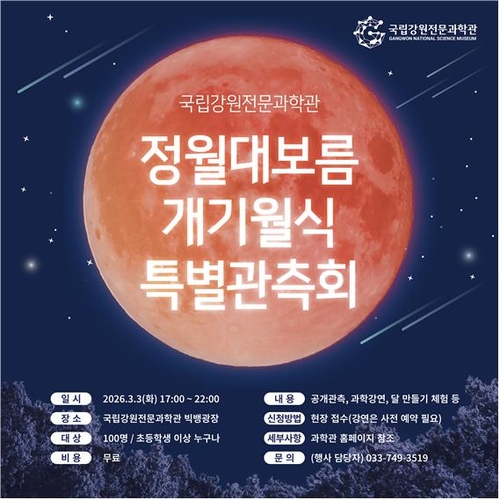 국립강원전문과학관 손석준 관장은 24일 "이번 개기월식은 1990년 이후 무려 36년 만에 정월대보름에 일어나는 개기월식으로 강원지역 주민들이 천체현상을 보다 가까이에서 체험할 수 있도록 행사를 마련했다"고 말했다.