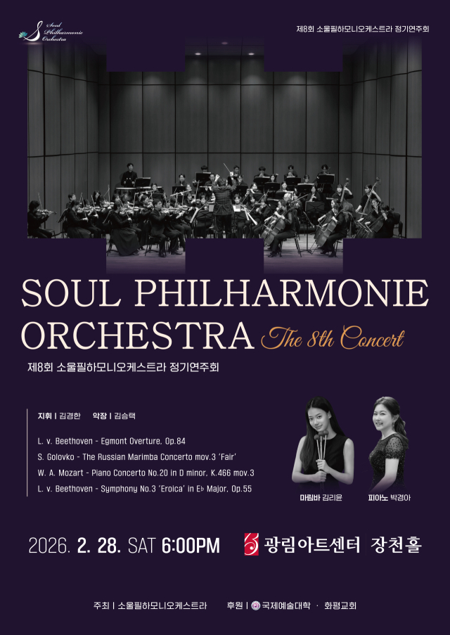 이번 공연에는 베토벤, 모차르트, 골로브크 등 고전과 낭만의 깊이를 아우르는 프로그램으로 구성된다. 세르게이 골로브코의 마림바 협주곡과 모차르트 피아노 협주곡 3악장 등을 통한 협연 무대, 베토벤 교향곡 제3번 ‘영웅’ 을 통해 소울필하모니의 음악적 도전과 성장을 담아낼 예정이다.