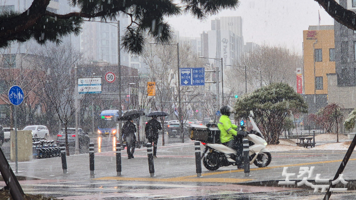 24일 오후 3시쯤 행인들이 눈을 맞으며 대구 동구 신암동 대구파티마병원 앞을 지나가고 있다. 곽재화 기자 |