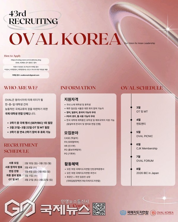 (서울=국제뉴스) 이지영 기자= 국내 유일의 한‧중‧일 대학생 국제 연합 단체인 OVAL KOREA(오발코리아)가 지난 15일부터 오는 3월 2일까지 제43기 신입 부원을 모집한다.