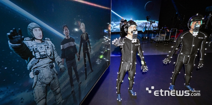 경험과 몰입을 중심으로 콘텐츠 산업 패러다임이 전환중인 가운데 네이버가 버추얼 콘텐츠를 구현하는 '미디어 프로덕션 테크놀로지'로 확장현실(XR) 콘텐츠를 제공한다. 24일 경기 성남시 네이버1784에 마련된 3D콘텐츠 전문 제작 스튜디오 '모션·비전스튜디오'에서 관계자가 버추얼 콘텐츠 제작 시연을 하고 있다.