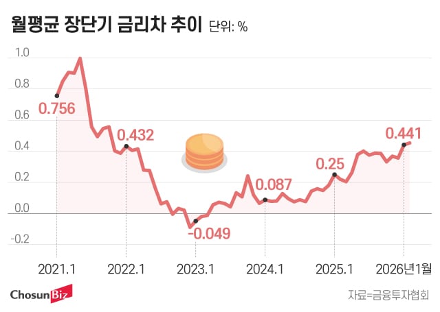 반면 단기 금리는 기준 금리가 장기간 동결되면서 제자리걸음을 하고 있다. 한국은행은 지난해 2월과 5월 기준금리를 인하한 뒤 같은 해 7월부터 올해 1월까지 다섯 차례 연속 연 2.5%로 동결했다. 시장에서는 금리 인하 사이클이 사실상 마무리됐다는 평가도 나온다. 이에 따라 3년물 국채금리는 1월 말 이후 이달 23일까지 3.15% 안팎에서 유지되고 있다.
