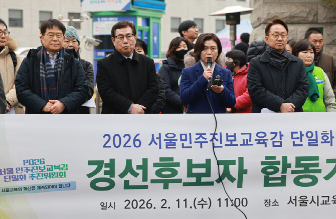 강민정(왼쪽에서 세번째) 전 더불어민주당 의원이 지난 11일 서울 종로구 서울시교육청 앞에서 열린 2026 서울 민주진보교육감 단일화 경선 후보자 합동 기자회견에서 발언하고 있다. (사진=연합뉴스) |