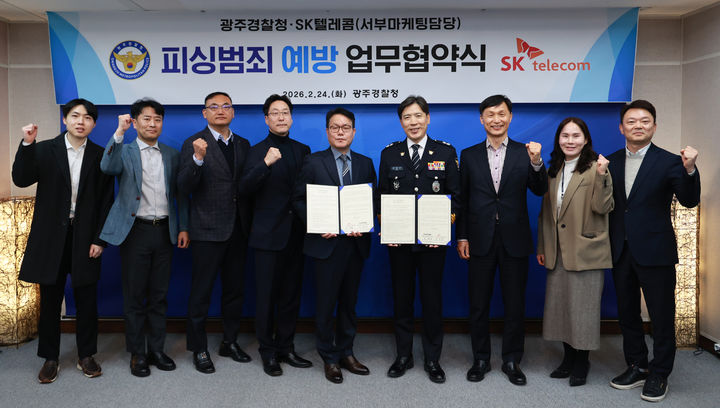 [광주=뉴시스]박기웅 기자 = 광주경찰청은 24일 SK텔레콤 서부마케팅담당과 피싱범죄 예방을 위한 업무협약을 체결했다.