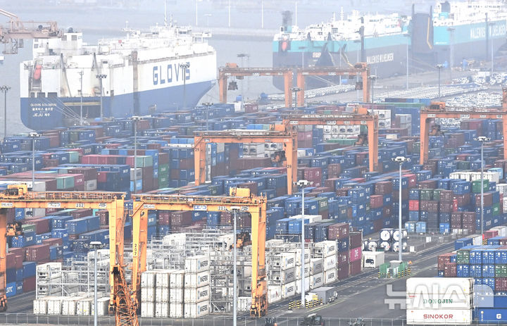 [평택=뉴시스] 김종택 기자 = 도널드 트럼프 미국 대통령이 무역법 122조를 근거로 부과하는 글로벌 관세가 당초 공언한 15%가 아닌 10%로 우선 시행된다. 사진은 22일 경기 평택시 포승읍 평택항 야적장에 수출입 컨테이너가 쌓여 있는 모습. 2026.02.22. jtk@newsis.com
