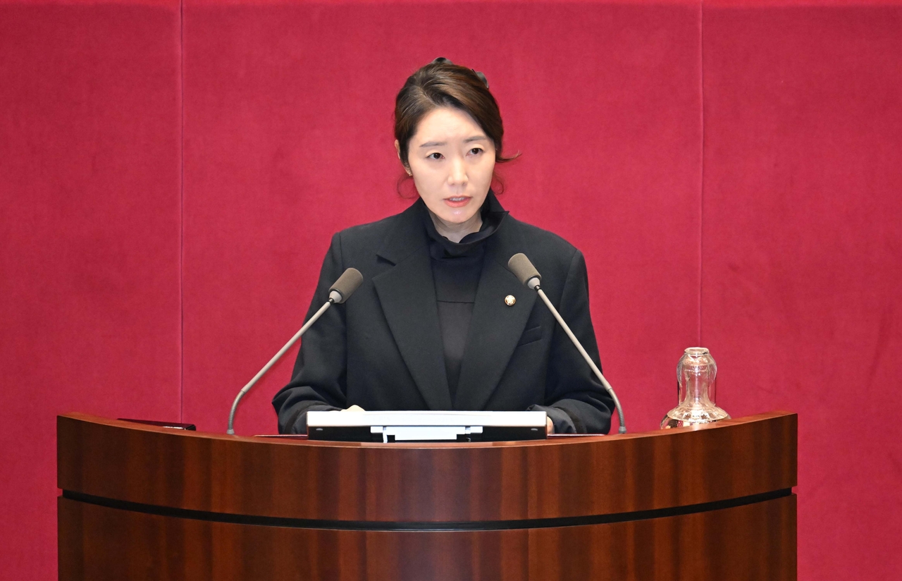 ‘공천헌금 1억원 수수’ 혐의로 구속영장이 청구된 무소속 강선우 의원이 24일 국회에서 열린 2월 임시국회 8차 본회의에서 자신의 체포동의안에 대한 신상 발언을 하고 있다. 이상섭 기자 |