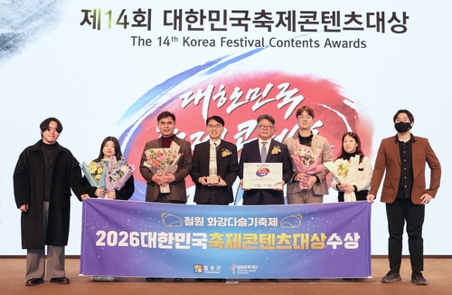 (철원=연합뉴스) 양지웅 기자 = 강원 철원지역 대표 여름 축제인 '화강 다슬기축제'가 24일 서울 용산 전쟁기념관에서 열린 '2026년 대한민국축제콘텐츠대상'에서 축제관광 부문 대상을 받았다.