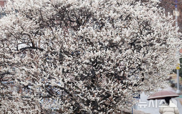 [서울·부산=뉴시스] 류현주 하경민 기자 = 봄을 재촉하는 비가 내린 24일 부산 수영구의 한 주택가에서 우산을 쓴 시민이 만개한 매화나무 아래를 지나고 있다.