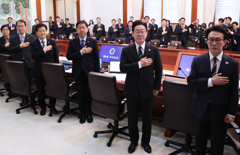 이재명 대통령이 24일 청와대에서 열린 국무회의에서 국기에 경례하고 있다. 연합뉴스 |