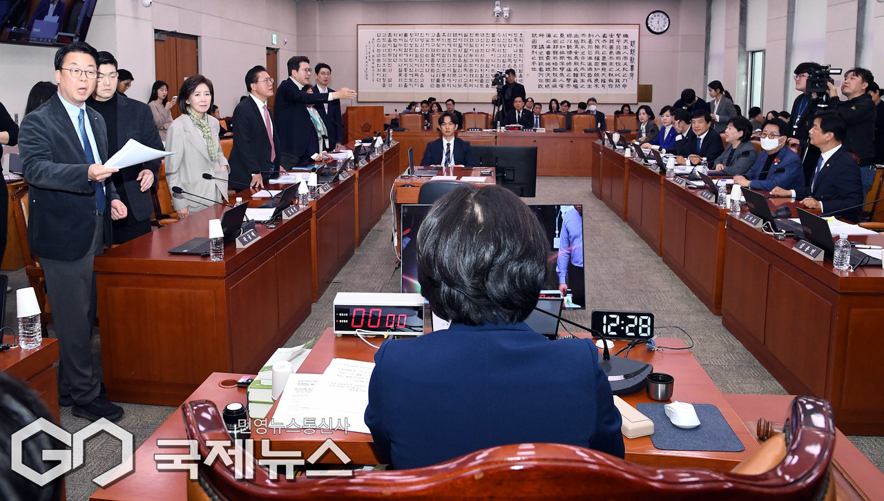 (서울=국제뉴스) 24일 서울 여의도 국회에서 열린 제432회국회(임시회) 법제사법위원회 제4차 전체회의에서 전남광주통합특별시 설치를 위한 특별법안(대안)에 대한 거수 표결이 진행되자 국민의힘 위원들이 항의하고 있다./사진=이용우 기자