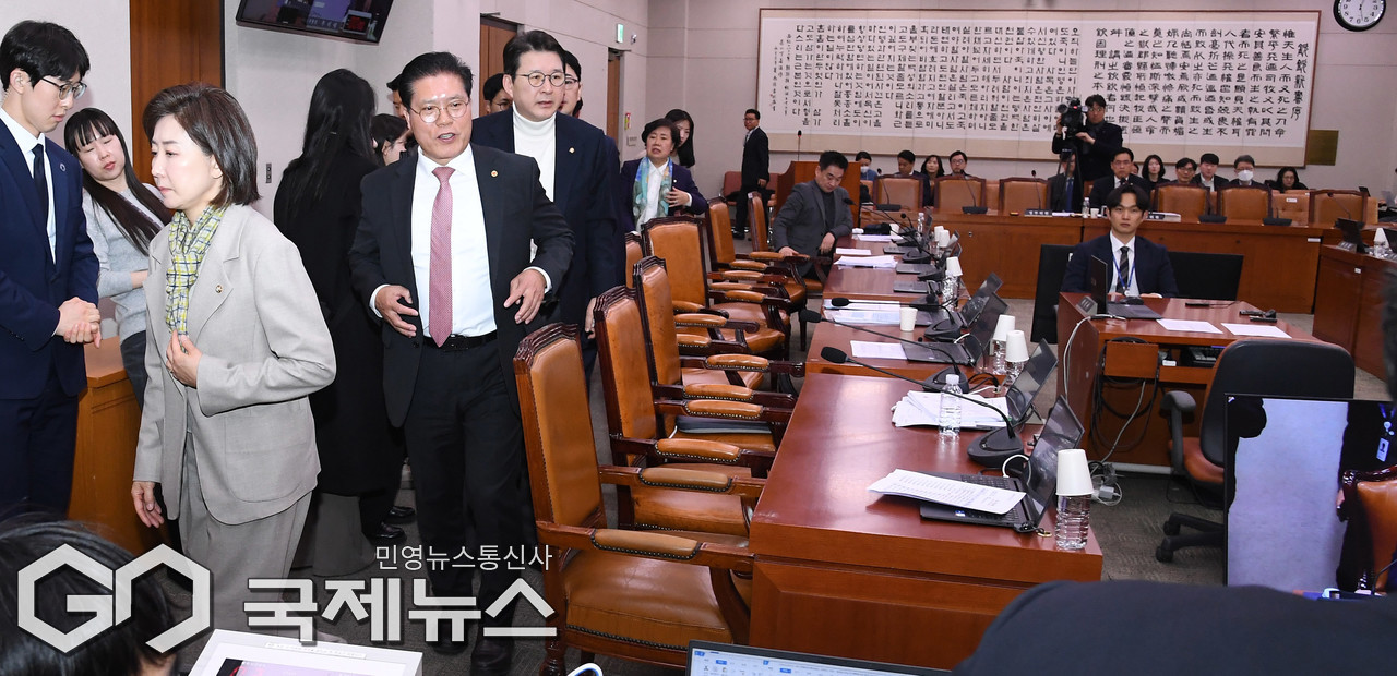 (서울=국제뉴스) 24일 서울 여의도 국회에서 열린 제432회국회(임시회) 법제사법위원회 제4차 전체회의에서 전남광주통합특별시 설치를 위한 특별법안(대안)에 대한 거수 표결이 진행되자 이를 거부한 국민의힘 위원들이 퇴장하고 있다./사진=이용우 기자