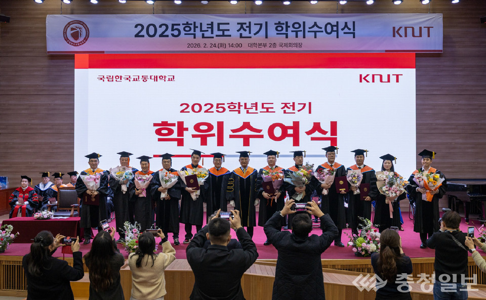 한국교통대학교가 24일 충주캠퍼스 국제회의장에서 '2025학년도 전기 학위수여식'을 갖고 졸업생들과 기념촬영하고 있다. |