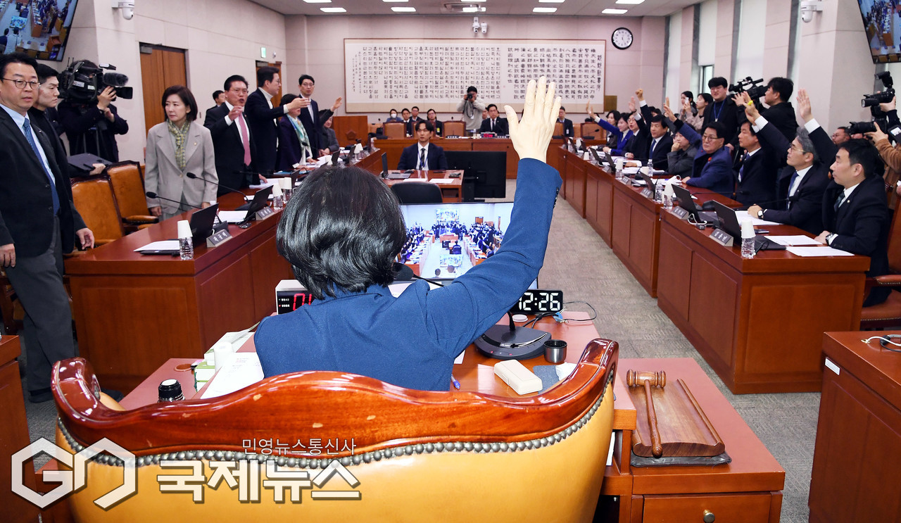 (서울=국제뉴스) 24일 서울 여의도 국회에서 열린 법제사법위원회 전체회의에서 전남광주통합특별시 설치를 위한 특별법안(대안)에 대한 거수 표결처리하고 있다./사진=이용우 기자