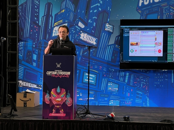 스콧 시(Scott Shi) Kite AI 공동 창립자 겸 CTO가 이더덴버 메인 스테이지에서 AI 기반 신뢰 서비스에 대해 설명하고 있다. 사진= 카이트 AI |
