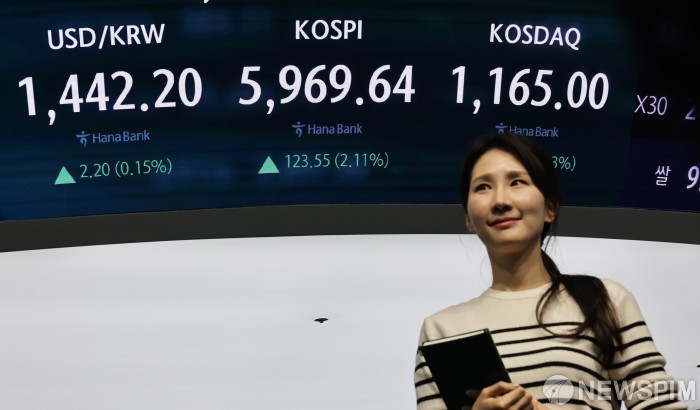 [서울=뉴스핌] 양윤모 기자= 24일 오후 코스피가 전장 종가보다 123.55 포인트(2.11%) 상승하며 5969.64로, 코스닥은 13.01 포인트(1.13%) 상승한 1165.00으로 거래를 마감한 가운데, 서울 중구 하나은행본점 딜링룸에서 직원들이 업무를 보고 있다. 서울외환시장에서 달러/원 환율은 전장 대비 2.20원 상승한 1442.20원에 주간거래를 마감했다. 2026.02.24 yym58@newspim.com