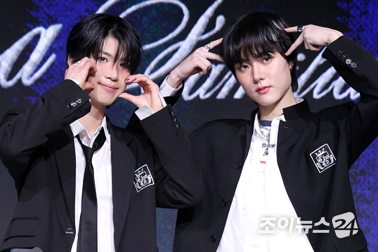 그룹 초코1(ChoCo1) 예찬, 태조가 24일 오후 서울 마포구 상암동 쇼킹케이팝센터에서 열린 초코엔터테인먼트 첫 패밀리 앨범 '초코 라 파밀리아(ChoCo La Familia)' 발매 기념 쇼케이스에 참석해 포즈를 취하고 있다. [사진=문수지 기자] |