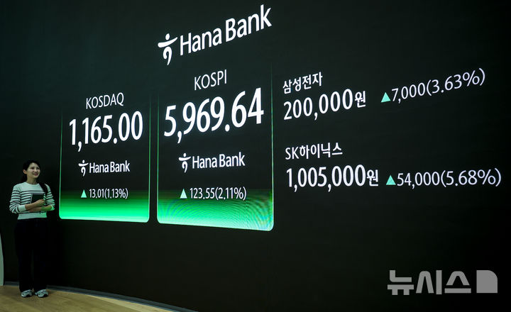 [서울=뉴시스] 정병혁 기자 = 24일 서울 중구 하나은행 딜링룸 전광판에 코스피 등 시황 정보가 나타나 있다.이날 코스피는 전 거래일(5846.09)보다 123.55포인트(2.11%) 오른 5969.64에 마감했다.삼성전자와 SK하이닉스는 이날 오후 장중 나란히 20만원, 100만원을 돌파했다. 삼성전자는 7000원 오른 20만원에, SK하이닉스는 5만4000원 오른 100만5000원에 거래를 마쳤다. 2026.02.24. jhope@newsis.com |