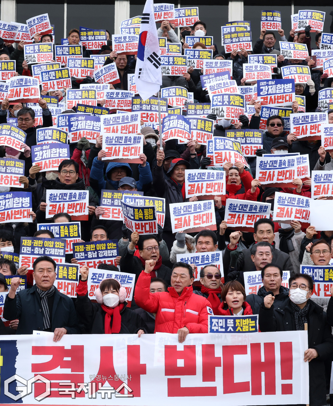 (서울=국제뉴스) 24일 서울 여의도 국회 본관 앞에서 열린 대전·충남 졸속 통합 반대 범시·도민 총궐기대회에서 참가자들이 구호를 외치고 있다./사진=이용우 기자