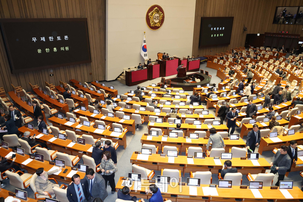 24일 서울 여의도 국회 본회의에서 상법 일부개정법률안(대안)과 관련해 윤한홍 국민의힘 의원이 무제한토론(필리버스터)을 시작하자 의원들이 퇴장하고 있다. 고이란 기자 photoeran@ |