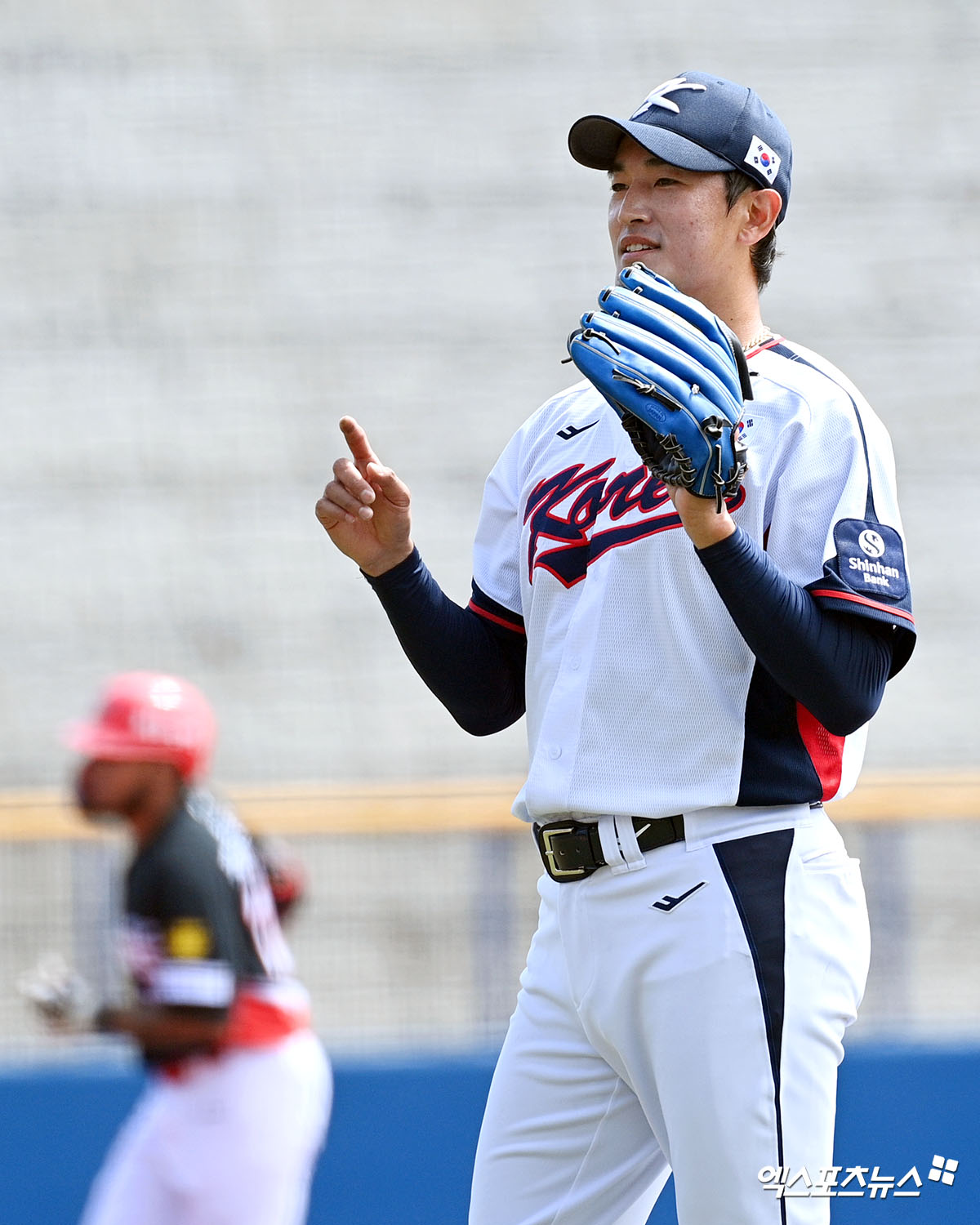 (엑스포츠뉴스 오키나와(일본), 고아라 기자) 24일 일본 오키나와 카데나 구장에서 열린 KIA 타이거즈와 WBC 대표팀의 연습경기, 1초 2사 2루 대표팀 선발 고영표가 KIA 카스트로에게 투런포를 허용한 뒤 아쉬워하고 있다.