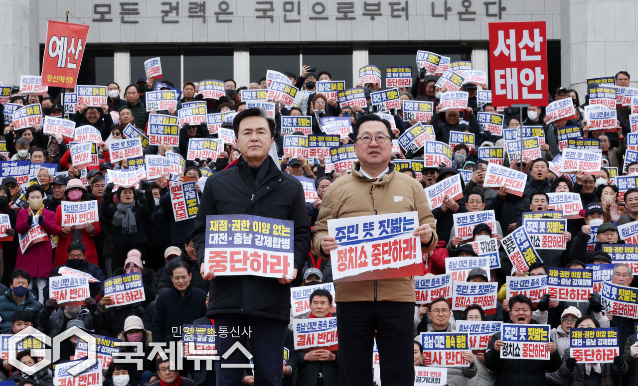 (서울=국제뉴스) 김태흠 충남도지사와 이장우 대전시장이 24일 오후 서울 여의도 국회 본청 계단에서 열린 대전·충남 졸속 통합 반대 범시·도민 총궐기대회에서 참가자들에게 인사를 하고 있다./사진=이용우 기자